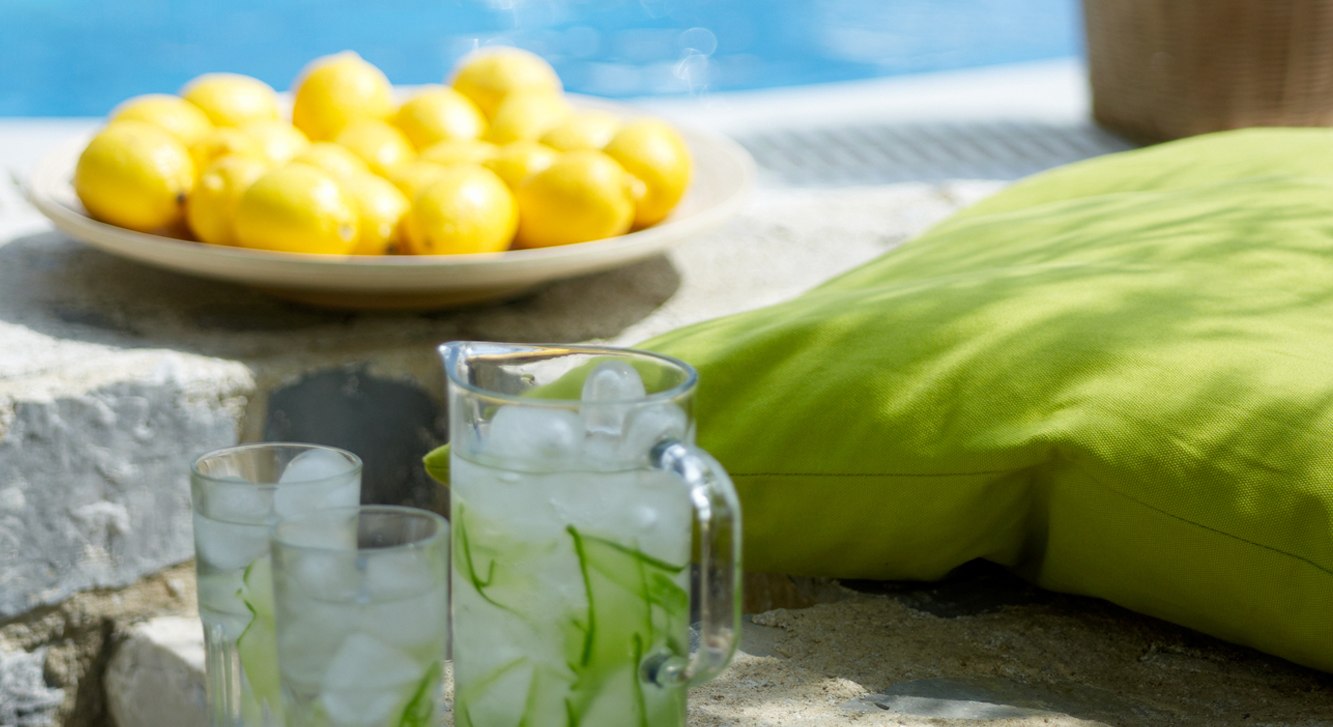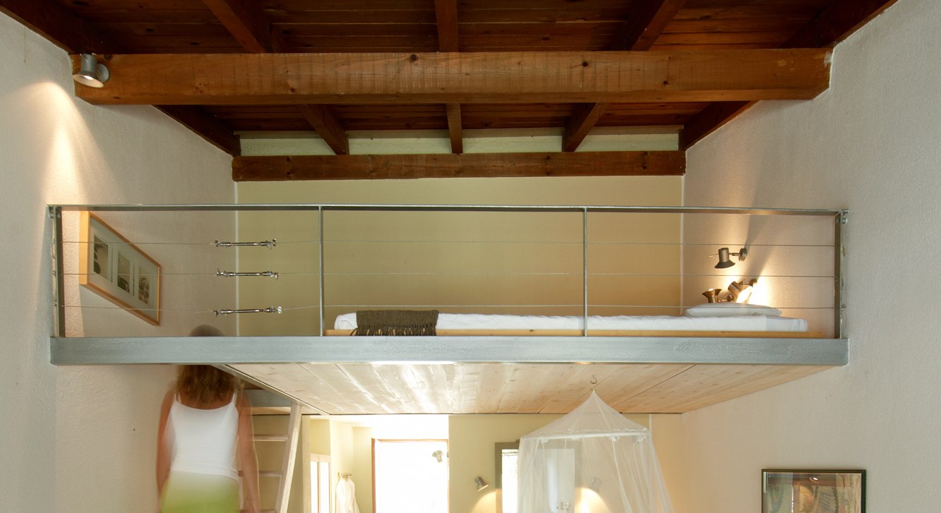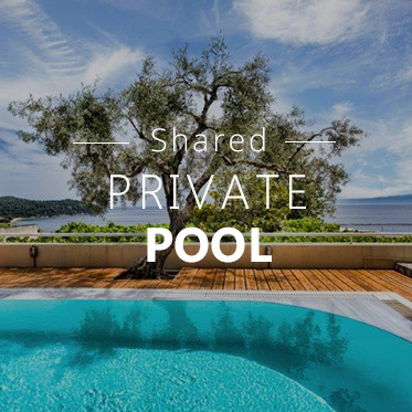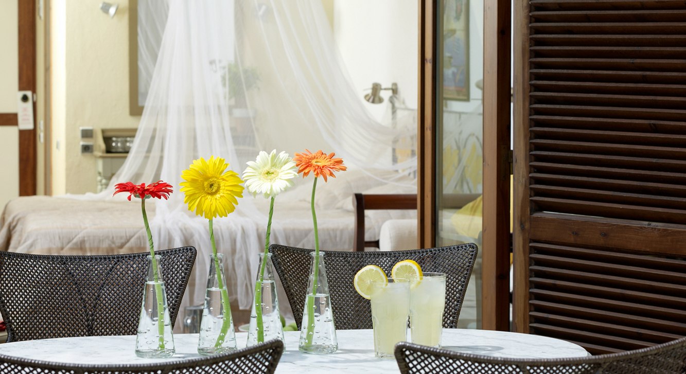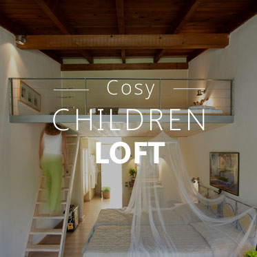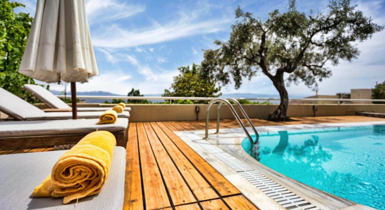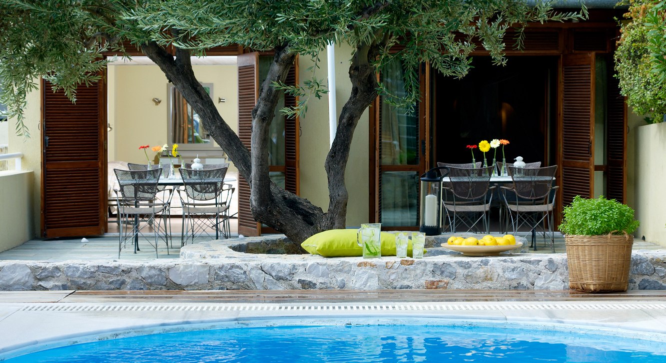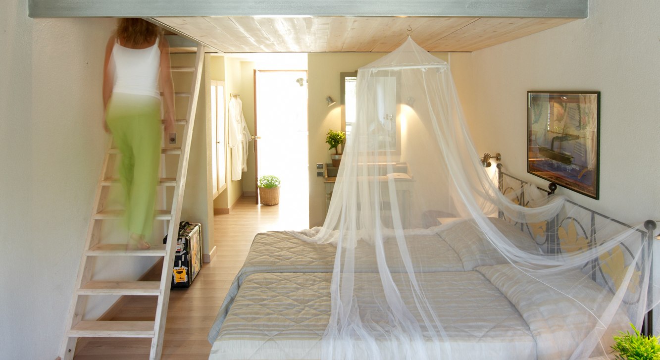 A high-ceilinged and open-plan room, 38m², with a shared pool, it is located on the sixth level of the hotel. It comfortably accommodates two adults on the ground floor on two twin beds or one double, and there is a sleeping area in the loft for the children. Earth tones, wooden ceilings and floors provide a pleasing, relaxing ambience for you to unwind in comfort. The spacious patio features an enchanting view of our vineyard, the hotel’s main pool and the open sea.